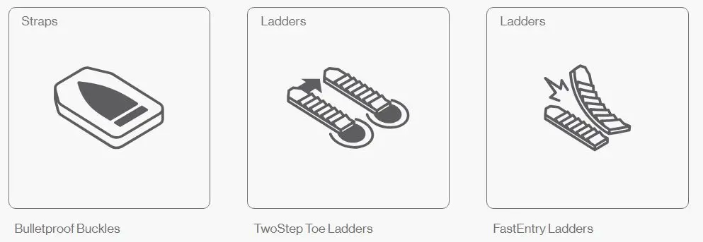 Kink Ladders giver dig mulighed for at ændre følelsen af din binding ved at vælge et lavt eller højt forbindelsespunkt til din ankelrem. Den lave position gør din binding mere tweakbar, den høje position giver en mere låst støtte og respons.