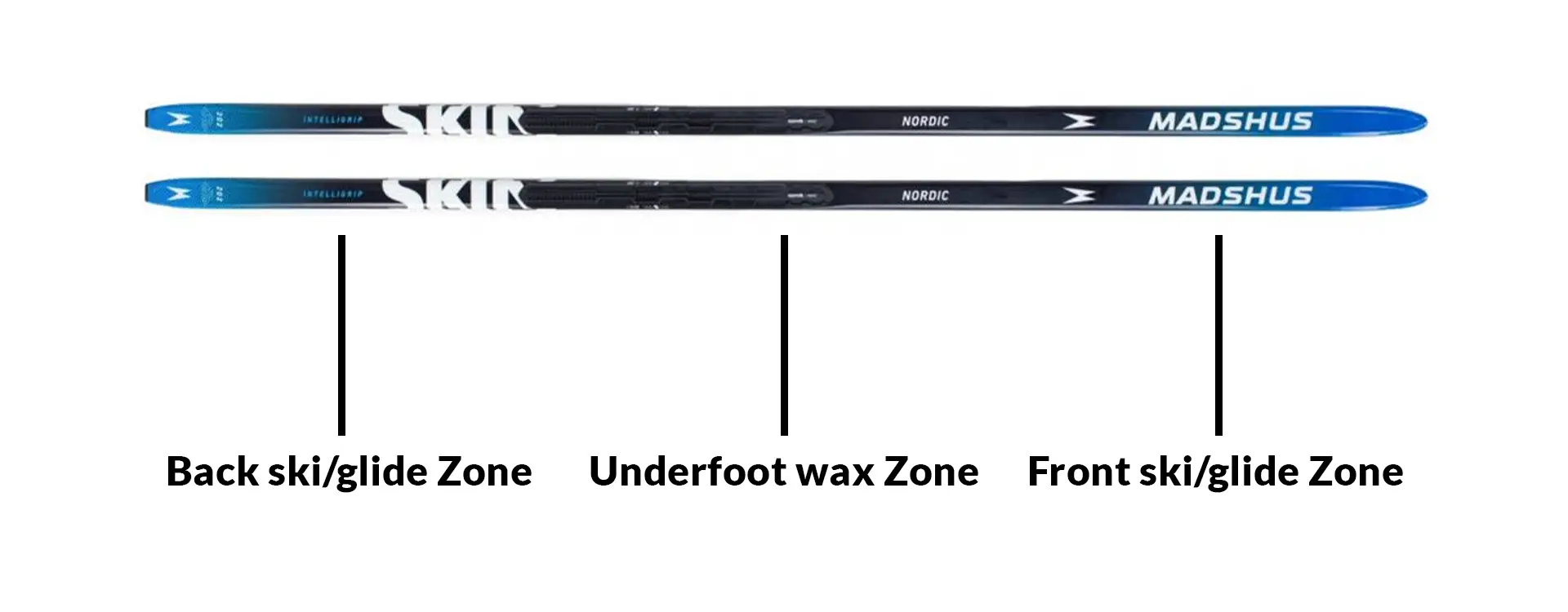 Den midterste del af skien, lige under foden, kaldes fæstezonen. Det er her, fæstevoksen påføres for at skabe det nødvendige greb, der gør det muligt at opnå et kraftfuldt fraspark. Når fæstezonen trykkes ned mod sneen, griber voksen fat og forhindrer skien i at glide bagud under frasparket. Det er vigtigt at vælge den rette type fæstevoks, som passer til sneforholdene og temperaturen, for at sikre effektivitet og kontrol. - Glidezoner (for- og bagenden af skien)